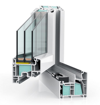 troslojno, 4* - 12 Kr - 4 - 12 Kr - 4*, (4 mm steklo, 12 mm medstekelni prostor, 4 mm steklo, 12 mm medstekelni prostor) lepljeno v krilo (s tem izboljšamo toplotno izolativnost okvirja do 20 % in povečamo varnost ter stabilnost okna), s termičnim PVC-distančnikom, Ug = 0,4 W/m2 K. Za steklitev oken standardno uporabljamo najnovejšo tehnologijo - lepljenja stekla v okensko krilo.